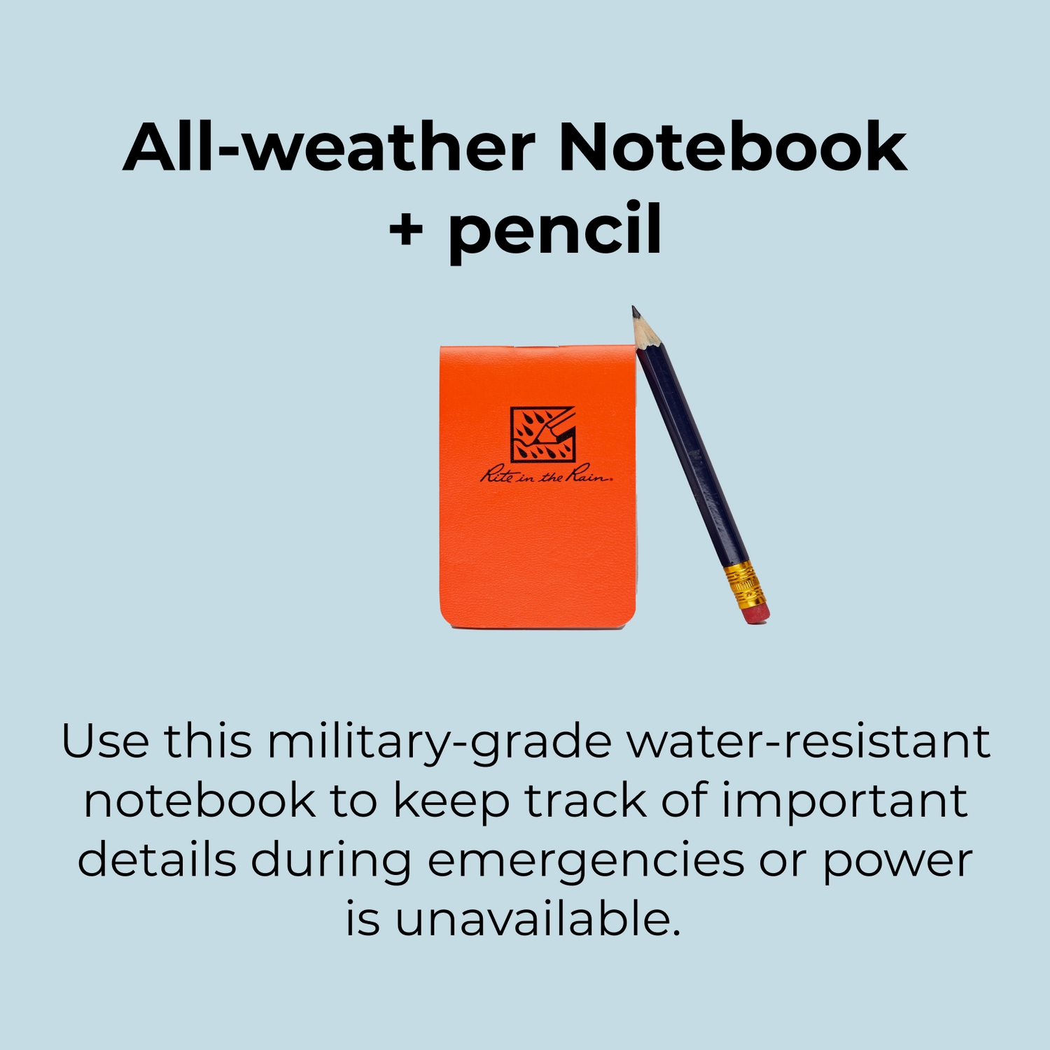 Use this military-grade water-resistant notebook to keep track of important details during emergencies or power is unavailable.