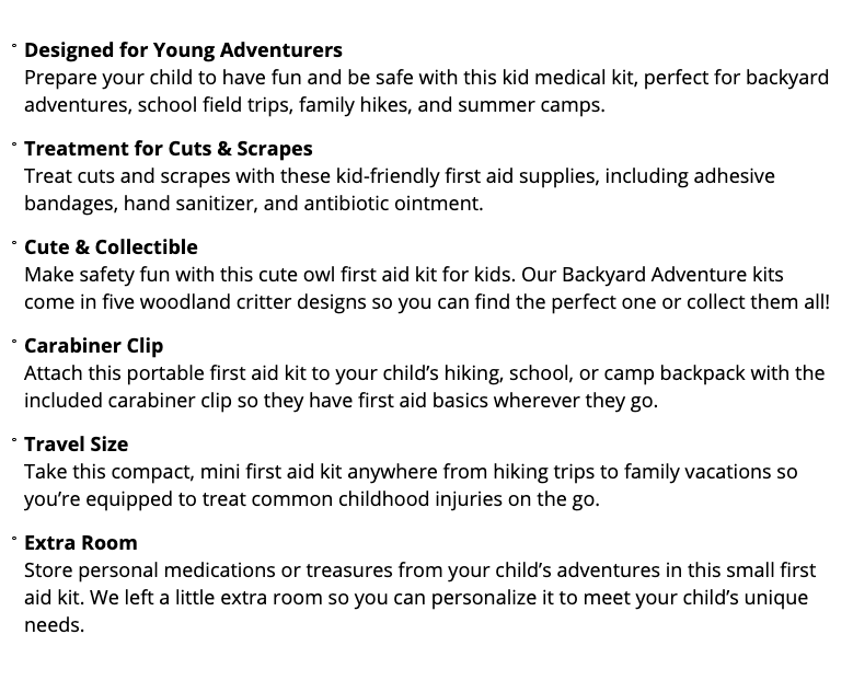 •  Carabiner clip makes it easy to connect a Backyard Adventure Medical kit to your little one's backpack