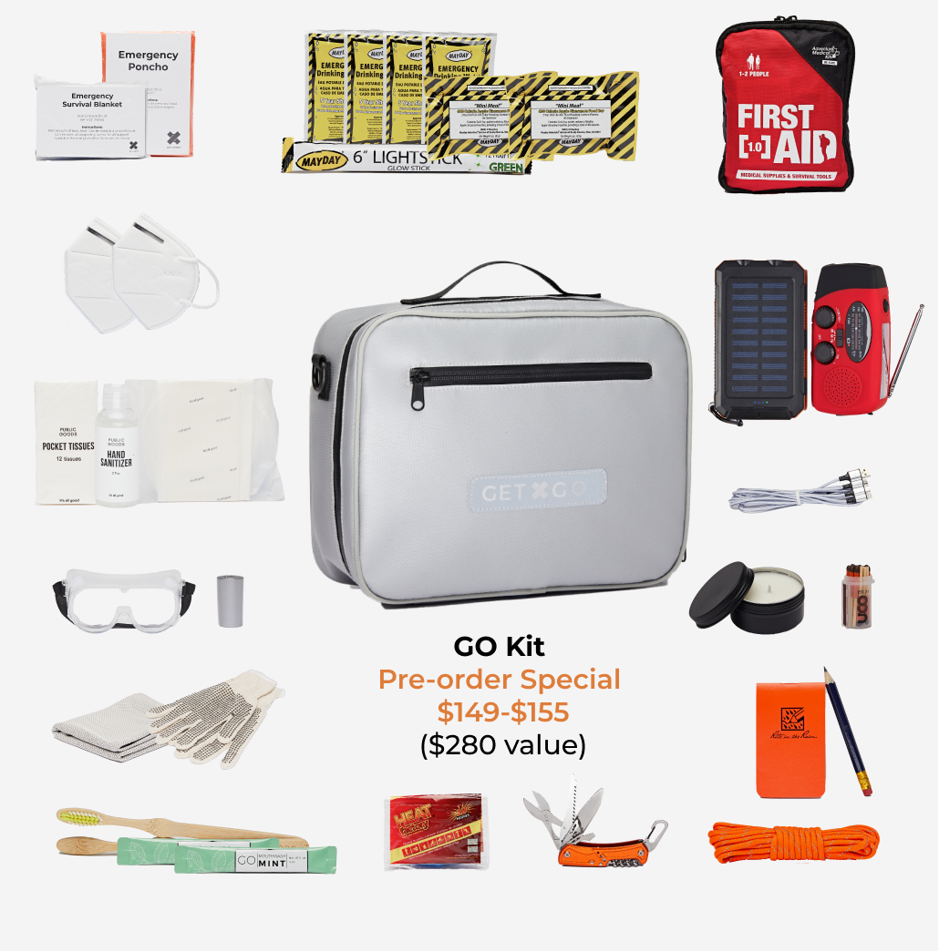 Grab-and-Go. The modernized all-in-one preparedness kit with over 40 smartly organized essentials. From solar-powered phone chargers, sanitary items, and first aid supplies, the GO Kit is here to equip and support the modern-day you.