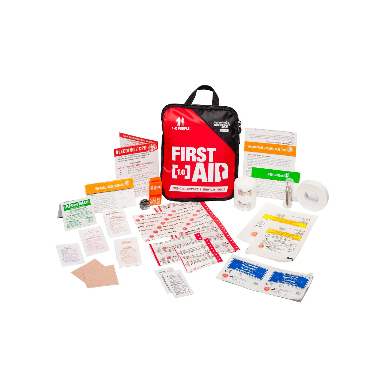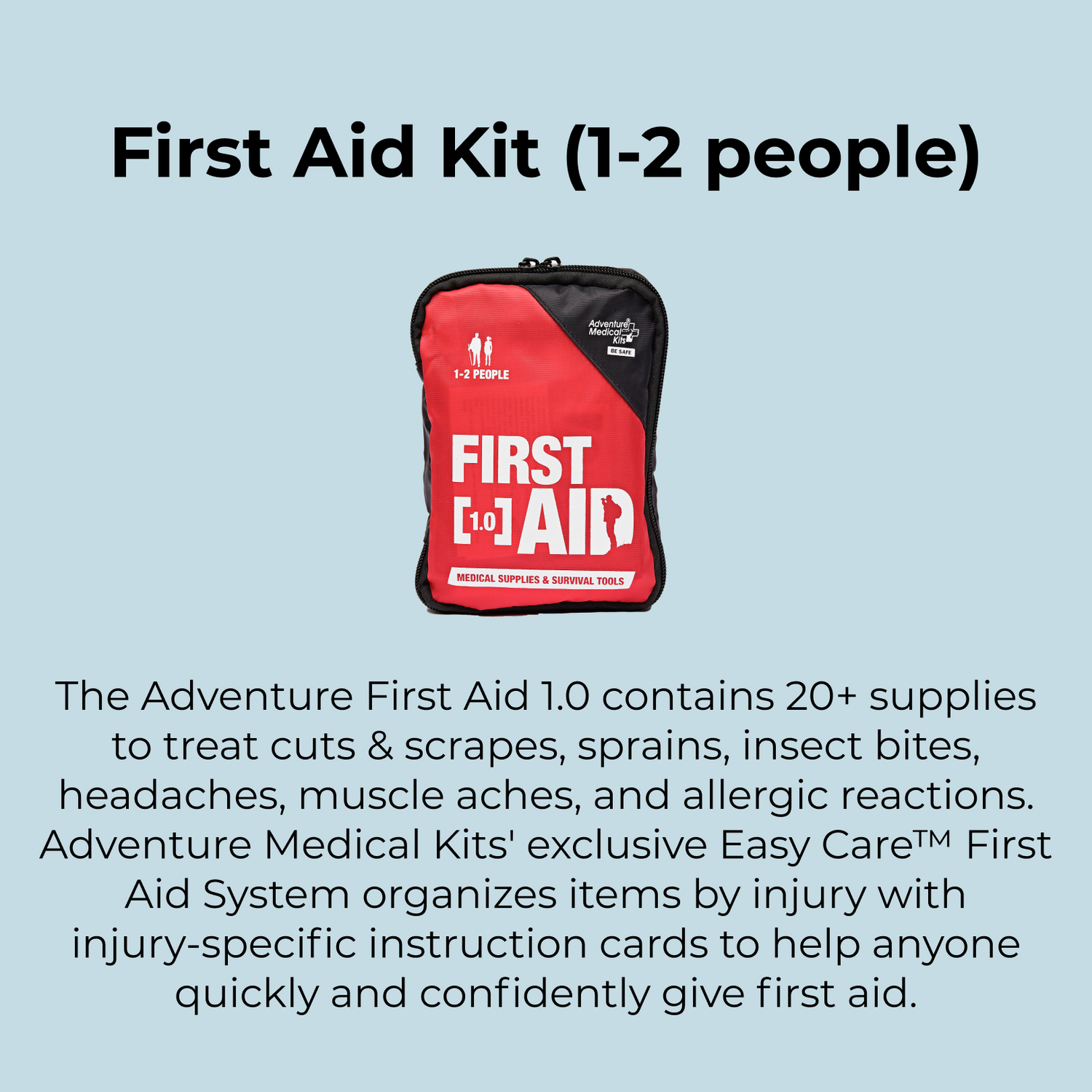 The Adventure First Aid 1.0 contains 20+ supplies to treat cuts & scrapes, sprains, insect bites, headaches, muscle aches, and allergic reactions. Adventure Medical Kits' exclusive Easy Care™ First Aid System organizes items by injury with injury-specific instruction cards to help anyone quickly and confidently give first aid.