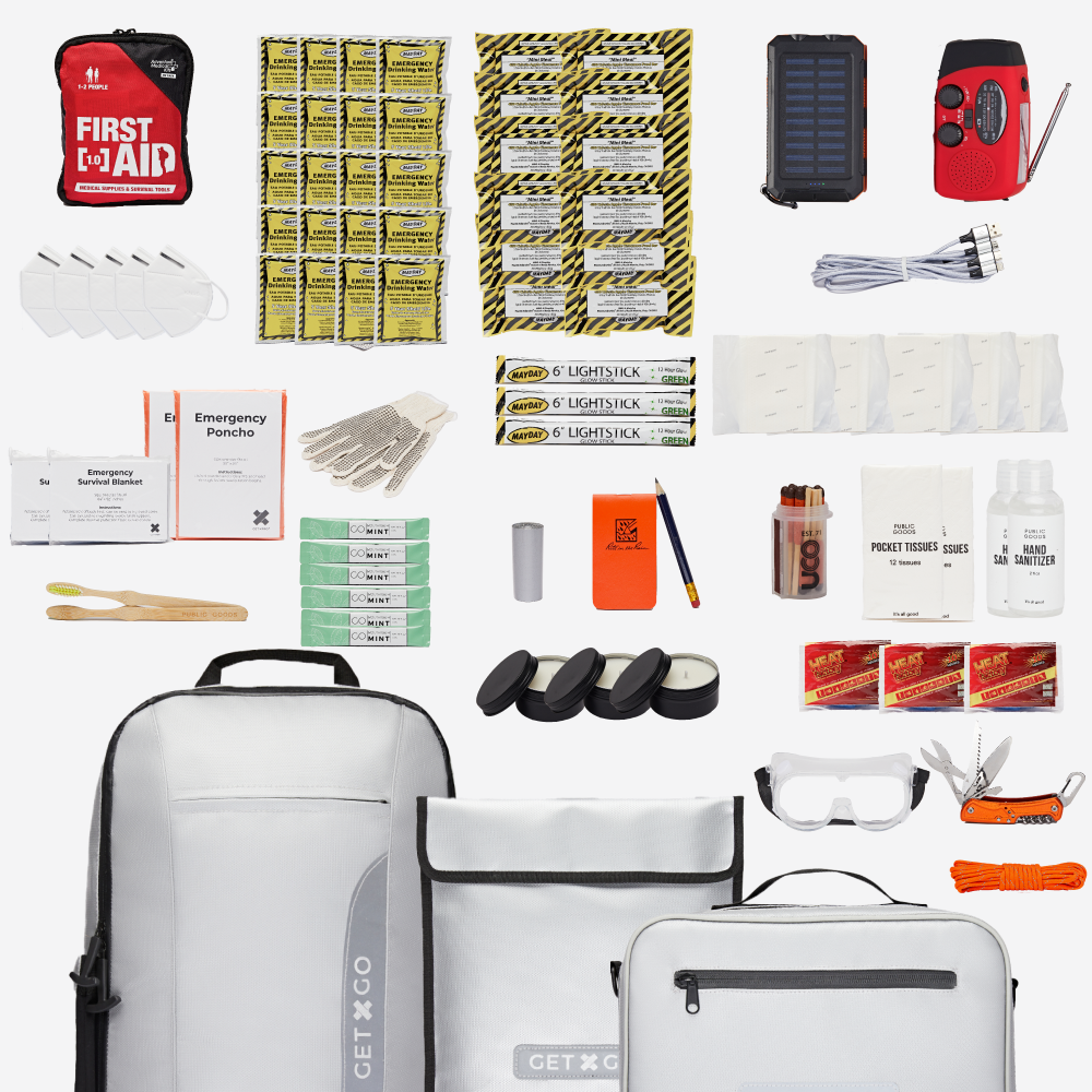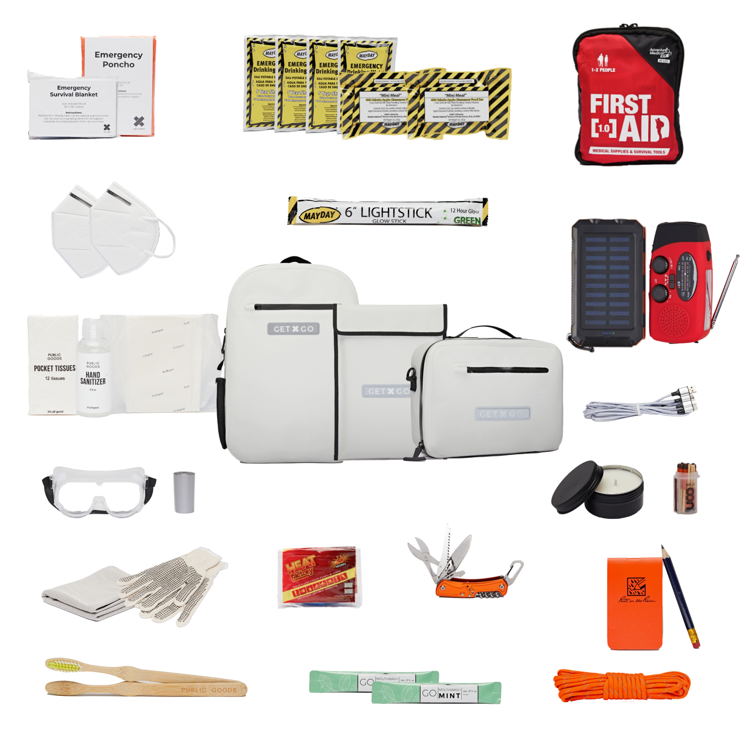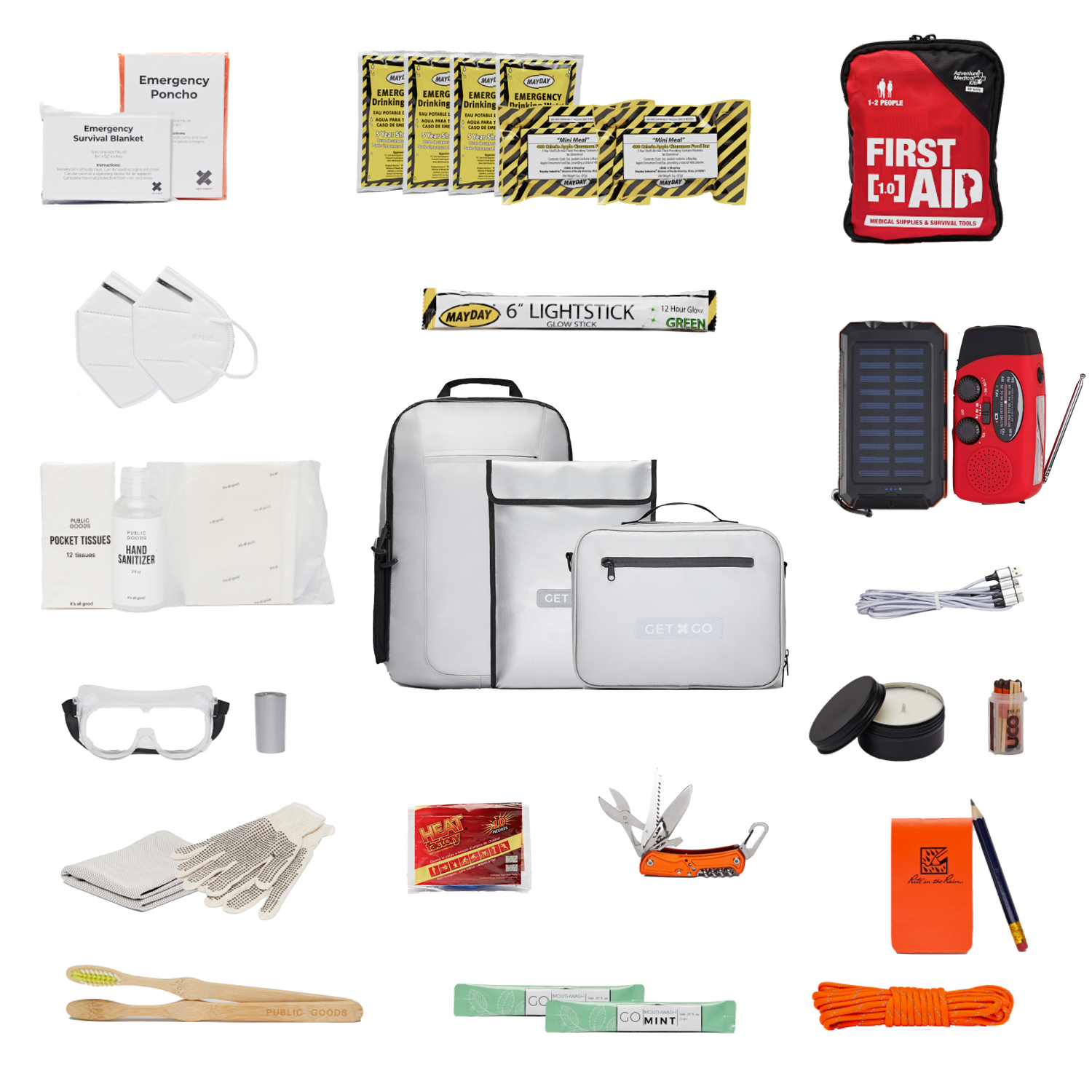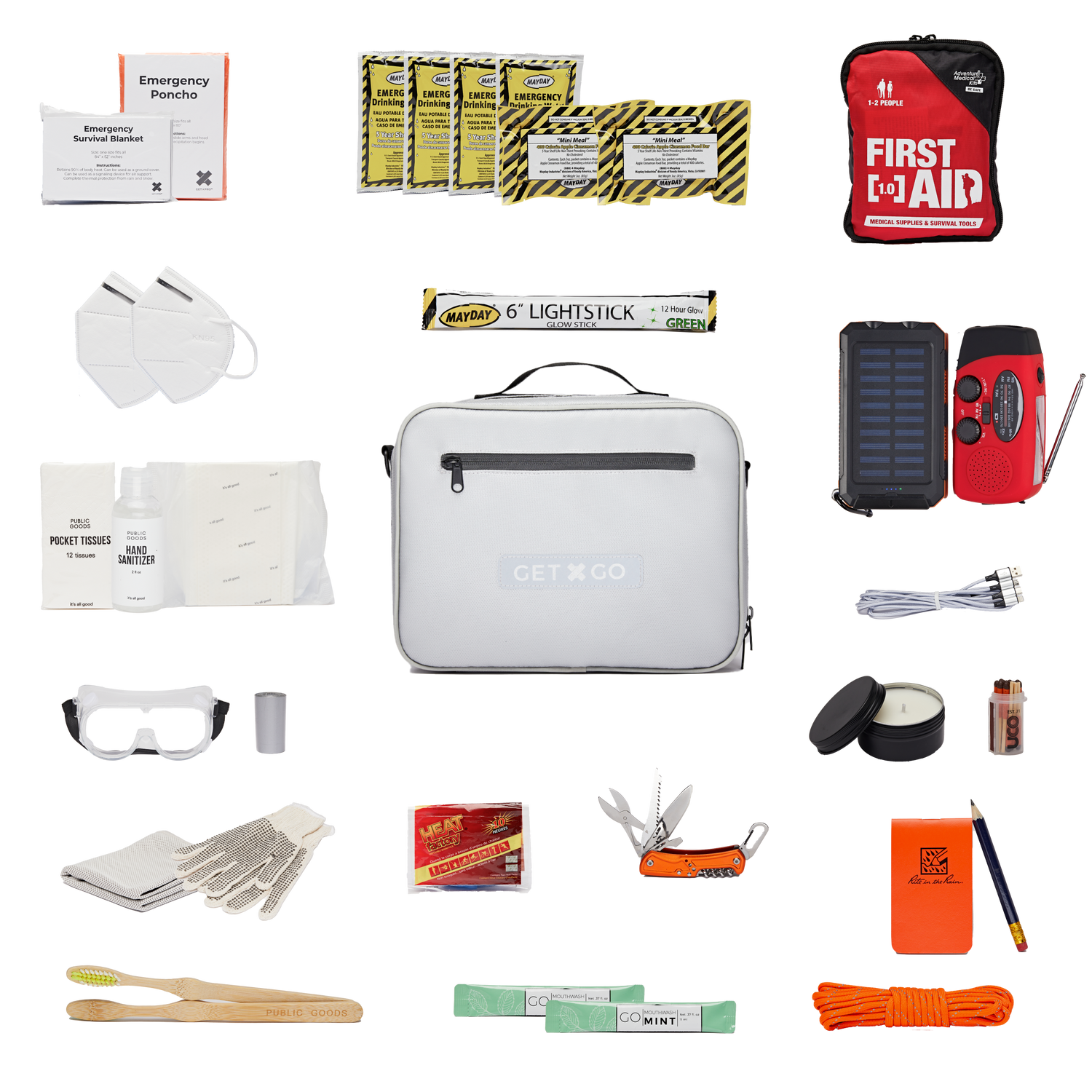Grab-and-Go. The modernized all-in-one preparedness kit with over 40 smartly organized essentials. From solar-powered phone chargers, sanitary items, and first aid supplies, the GO Kit is here to equip and support the modern-day you.