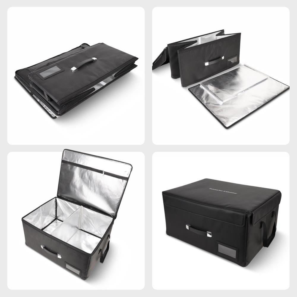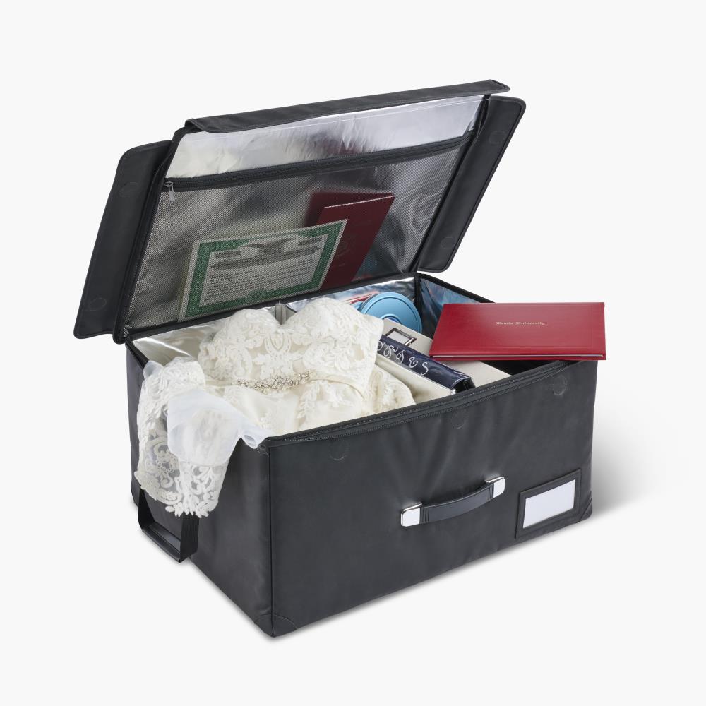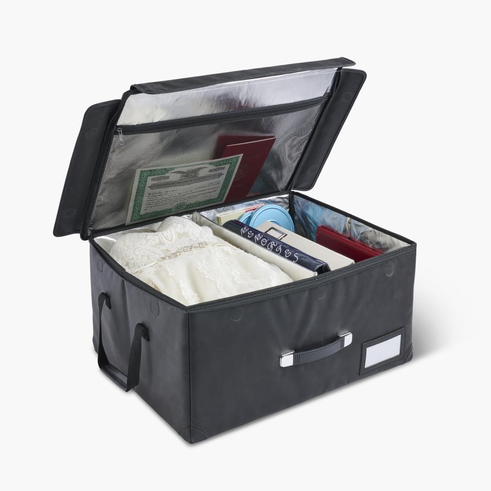 This fireproof and water-resistant keepsake box that protects irreplaceable treasures from flames up to 1,800º F. It protects family quilts, heirloom garments, and vintage keepsakes with three layers of high-quality silicone coated fiberglass, aluminum foil fiberglass lining, fireproof thread, and a water-resistant zipper. The interior hook-and-loop lining allows customizable organization for up to 50 lbs. of personal possessions. With built-in carrying handles.